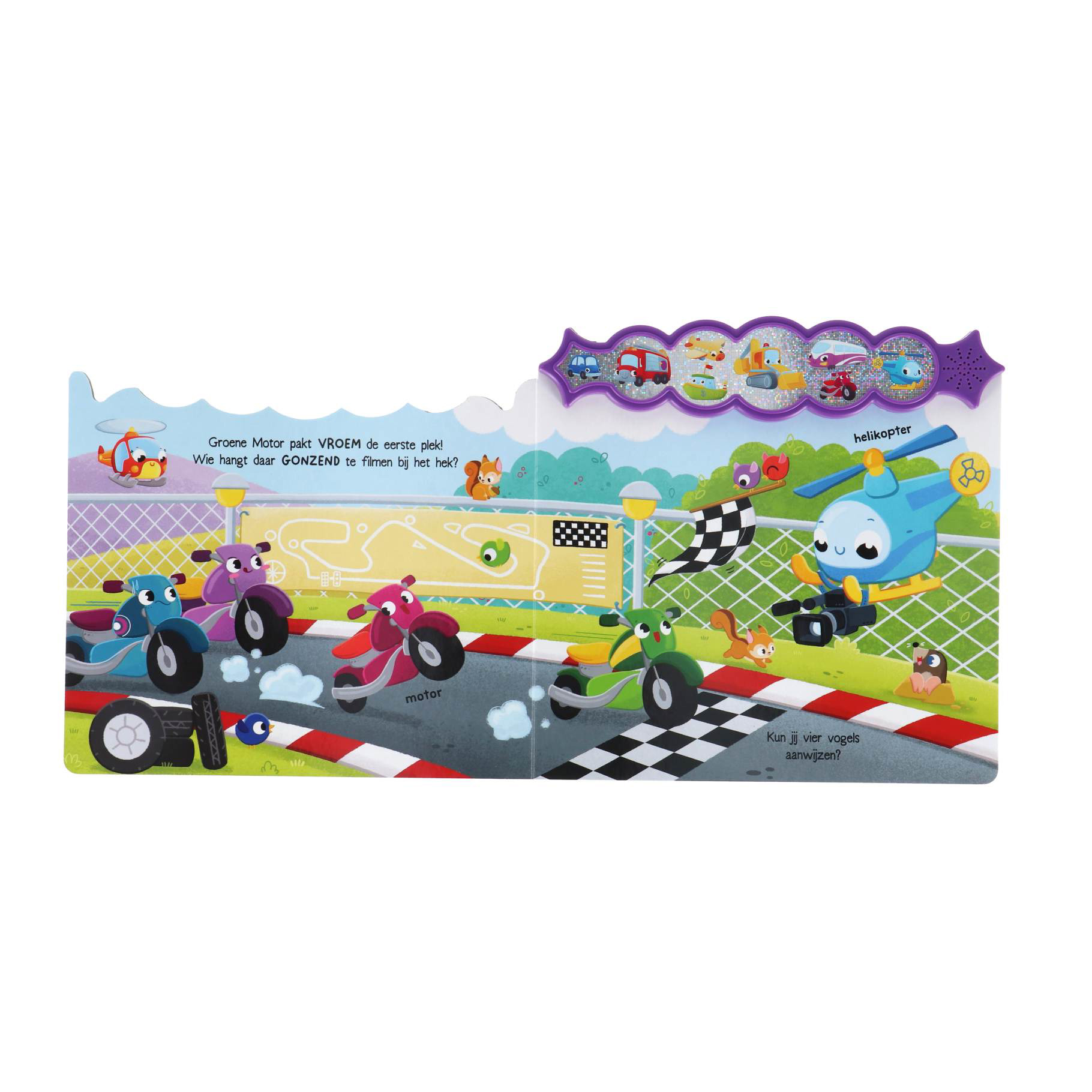 Druk op de knopjes en hoor 8 spannende geluiden, van VROEM tot TU-LA-LU-La! Op elke bladzijde valt van alles te ontdekken. Dit boek is een perfecte kennismaking met alles wat rijdt, vaart en vliegt!
