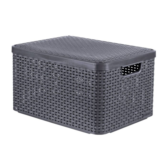 Dit aantrekkelijke 30-liter mandje van Curver in antraciet heeft een klassiek gevlochten ontwerp en wordt geleverd met een deksel voor een nette, stofvrije opslag. Gemaakt van duurzaam en eenvoudig te reinigen kunststof, past dit mandje moeiteloos in elke interieurstijl.