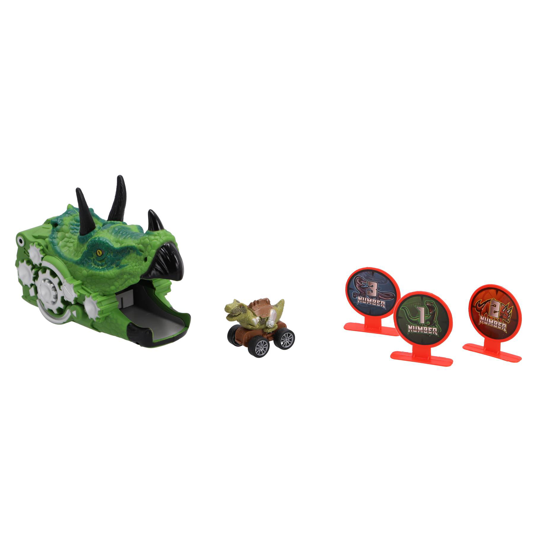 Dino speelset. Plaats de kleine dino-auto in de mond van de grote dino. Deze zal hem dan afvuren. Zet de 3 scoreborden neer en probeer ze te raken met je gelanceerde auto. 2 verschillende versies beschikbaar. Geschikt voor kinderen vanaf 3 jaar.