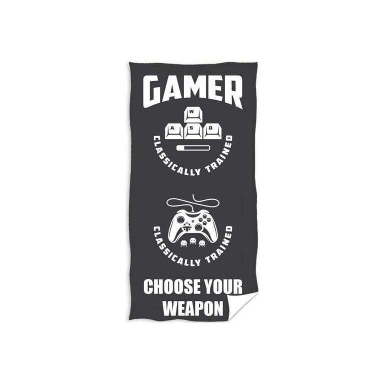 Gamer Choose your Weapon Met dit stoere strandlaken laat jij zien dat jij een gamer bent! Deze prachtige badhanddoek is natuurlijk ook geschikt voor het zwembad of de badkamer.