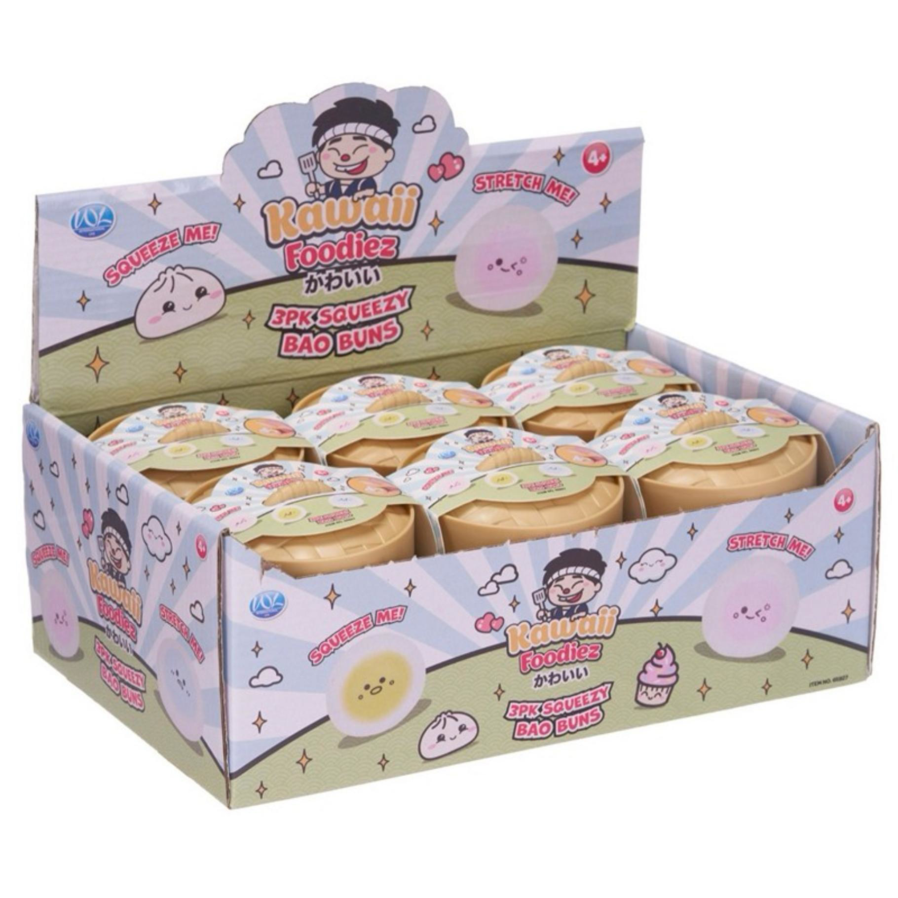 Set van 3 zachte Kawaii Kuties Squeezy Bao Buns. Assorti geleverd in vrolijke display. Gemaakt van squishy materiaal. Geschikt vanaf 3 jaar.