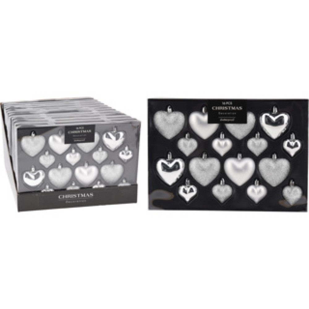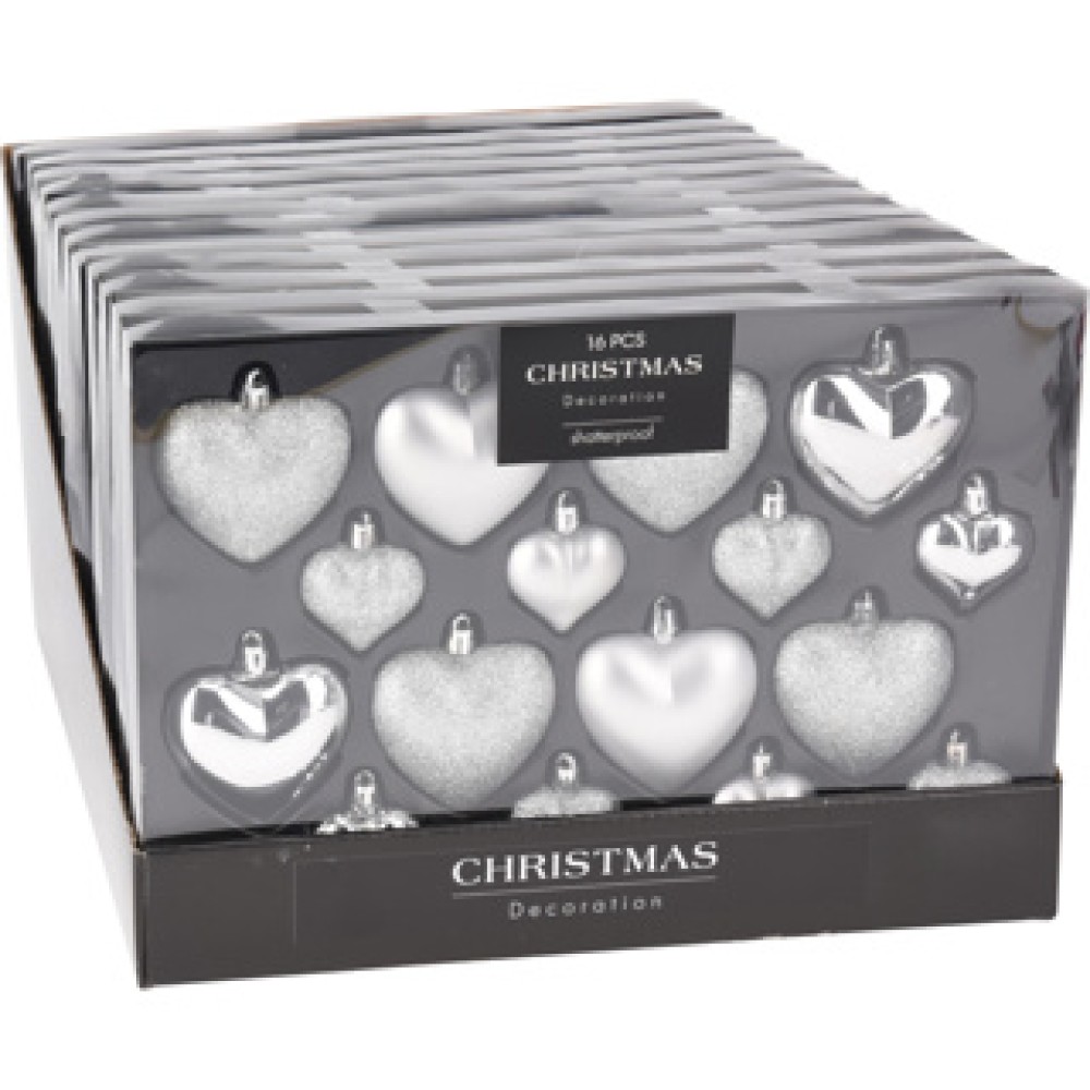 Versier je kerstboom dit seizoen met de mooie Kerstbal Heart. Deze set bevat 16 hartvormige kerstballen in zilver, perfect voor een feestelijke uitstraling. Met verschillende afwerkingen zoals glans, mat en glitter, geef je je boom een unieke look.