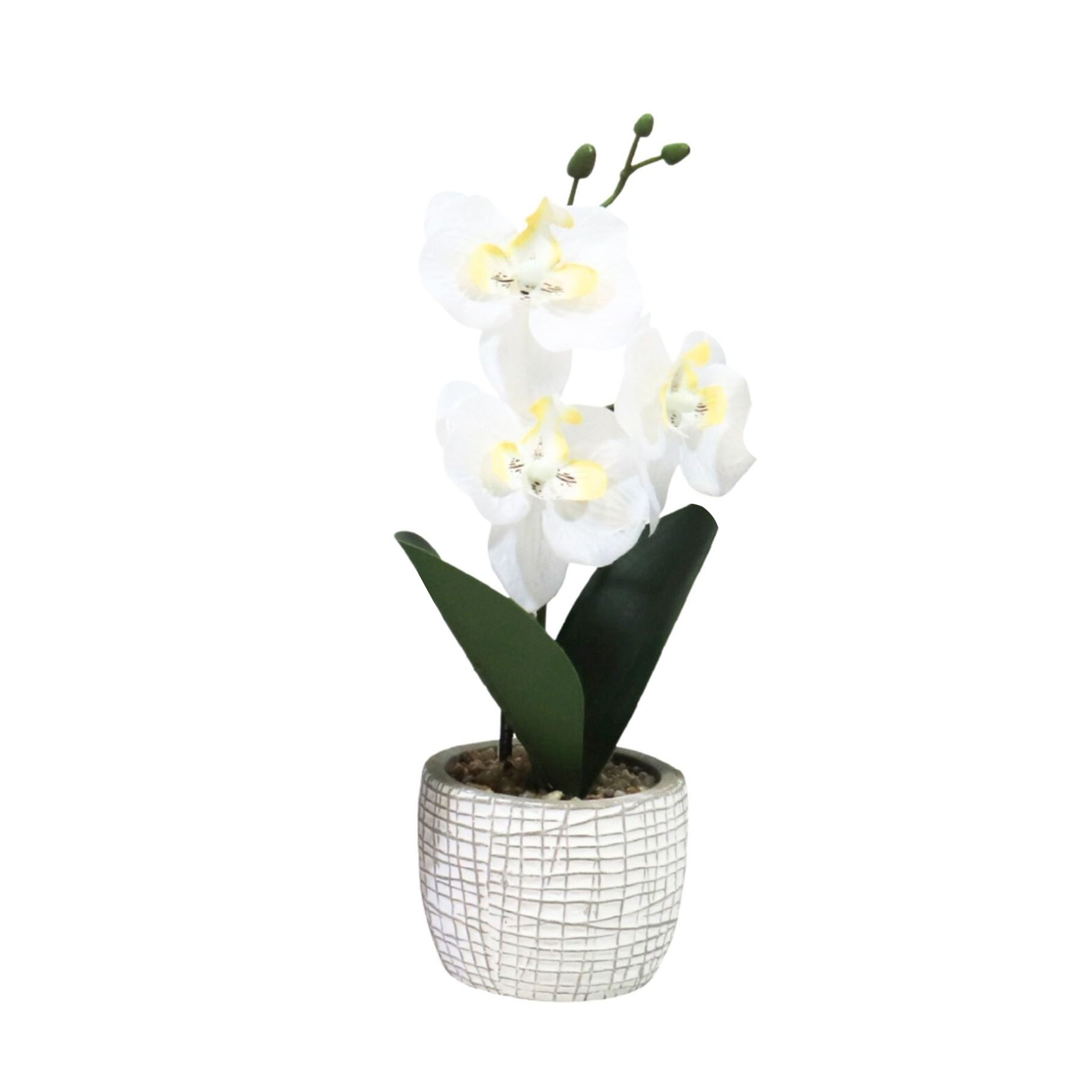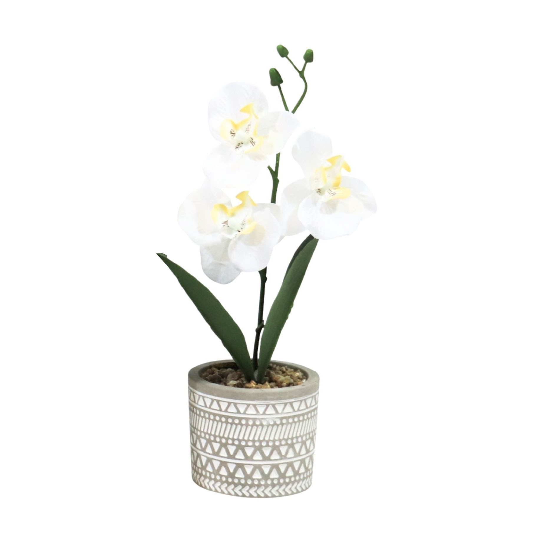 KUNST ORCHIDEE IN POT 28 CM 6 ASSORTI. Assortiment van 6 diverse kunst orchideeën in cement pot.
