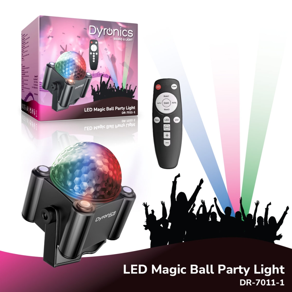 De Dyronics LED Magic Ball brengt direct sfeer in iedere ruimte. Deze compacte lichtbol projecteert kleurrijke lichteffecten die automatisch reageren op muziek. Ideaal voor feestjes, kinderkamers, verjaardagen, hobbyruimtes en kleine evenementen.
