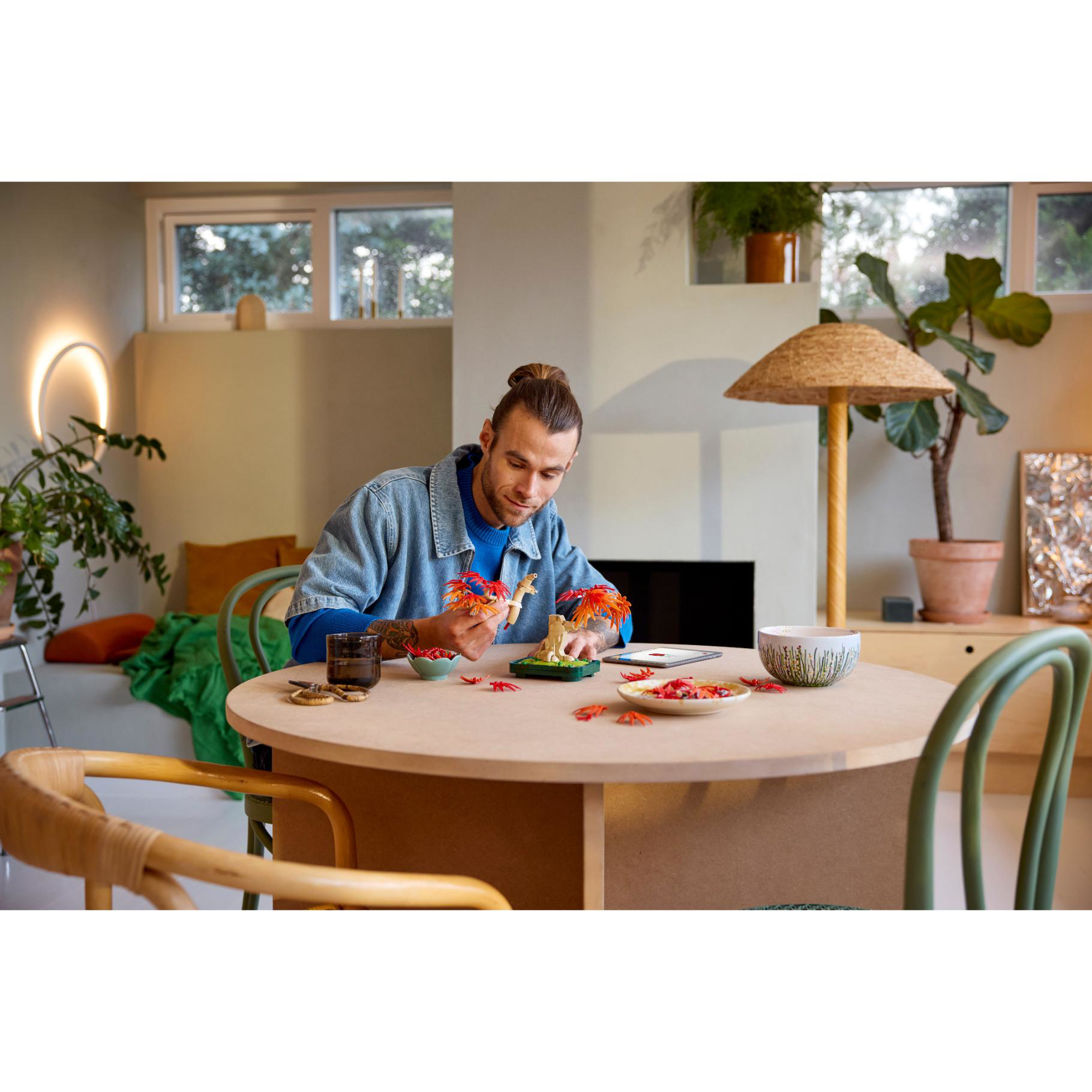 Breng rust in huis met het LEGO Botanicals Japanse esdoorn bonsaiboompje (10348) bouwpakket voor volwassenen. Deze op de natuur geïnspireerde LEGO planten set zit boordevol details en vormt een prachtig stukje huis of kantoor decoratie dat nooit zal verwelken of water nodig heeft. Deze LEGO plant met rode en oranje bladeren is net zo levendig en mooi als een echt esdoorn bonsaiboompje en staat in een donkergroene plantenpot. Ontspan je en kom helemaal tot rust terwijl je de kunstplant stukje voor stukje bouwt, voordat je hem met trots neerzet in je woonkamer als woondecoratie of kantoor voor een vleugje rust en sereniteit. Esdoorn bonsaiboompjes staan symbool voor vrede en evenwicht en brengen de ontvanger geluk en voorspoed. Deze LEGO set voor volwassenen is dan ook een ideaal cadeau voor vrouwen en mannen om te geven met een housewarmingparty, Valentijnsdag, Moederdag, Vaderdag of een verjaardag.