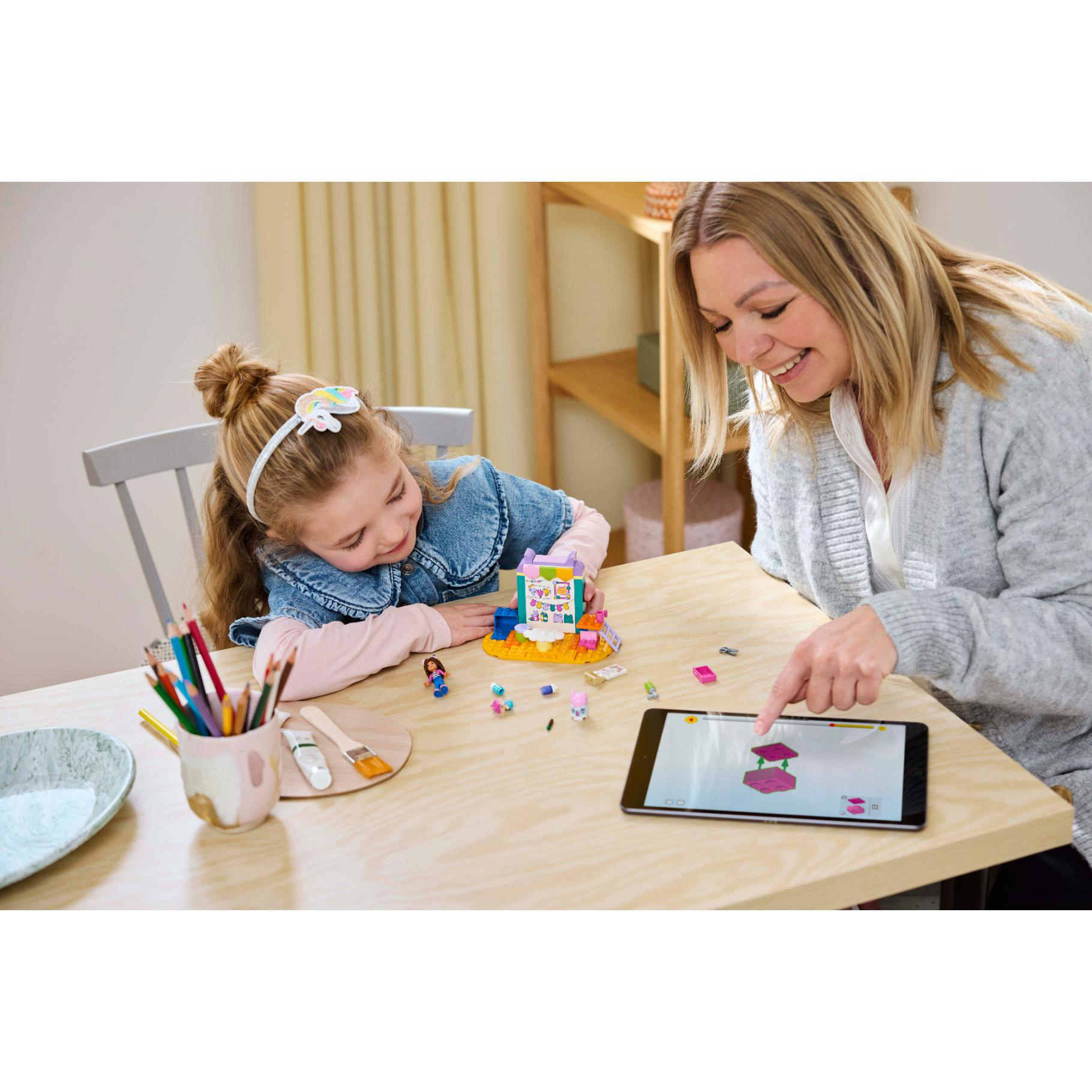 - Fantasiespeelgoed – kinderen helpen Gabby en Babykitty een schilderij en een model van Gabby’s poppenhuis te maken met behulp van een ladder