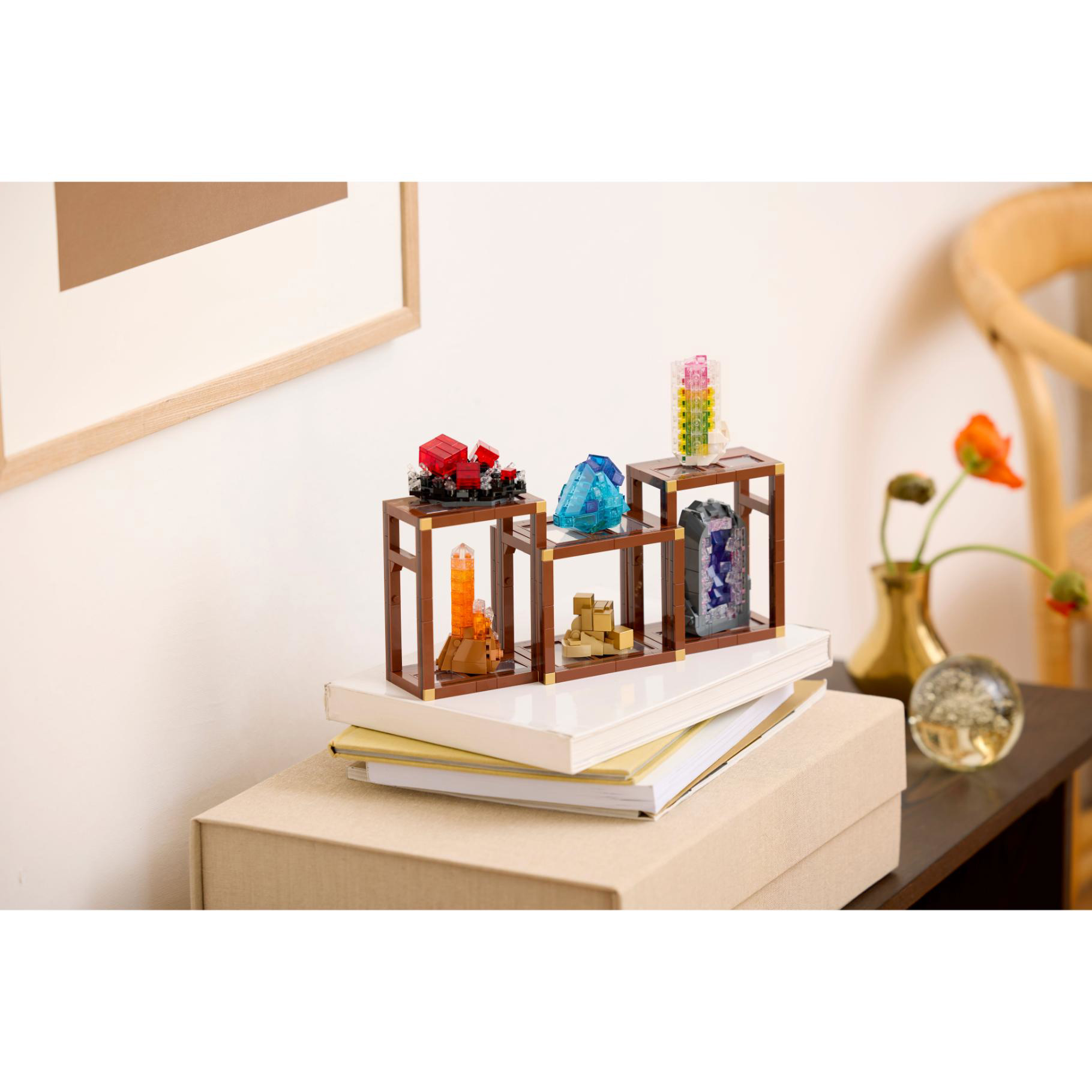 - Unieke woondecoratie – breng een eerbetoon aan de schoonheid van de natuur met de LEGO Ideas Mineralenverzameling: kleurrijke replica’s van 6 mineralen en 3 displayplanken om ze op neer te zetten