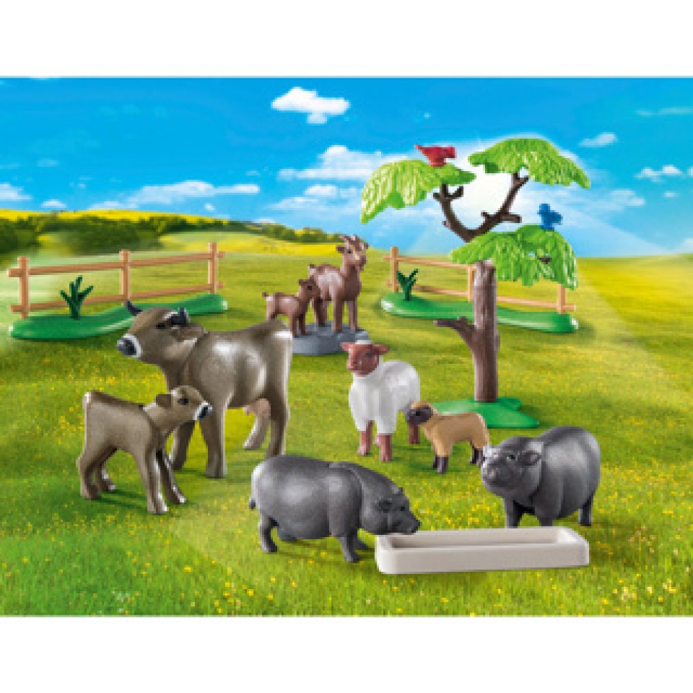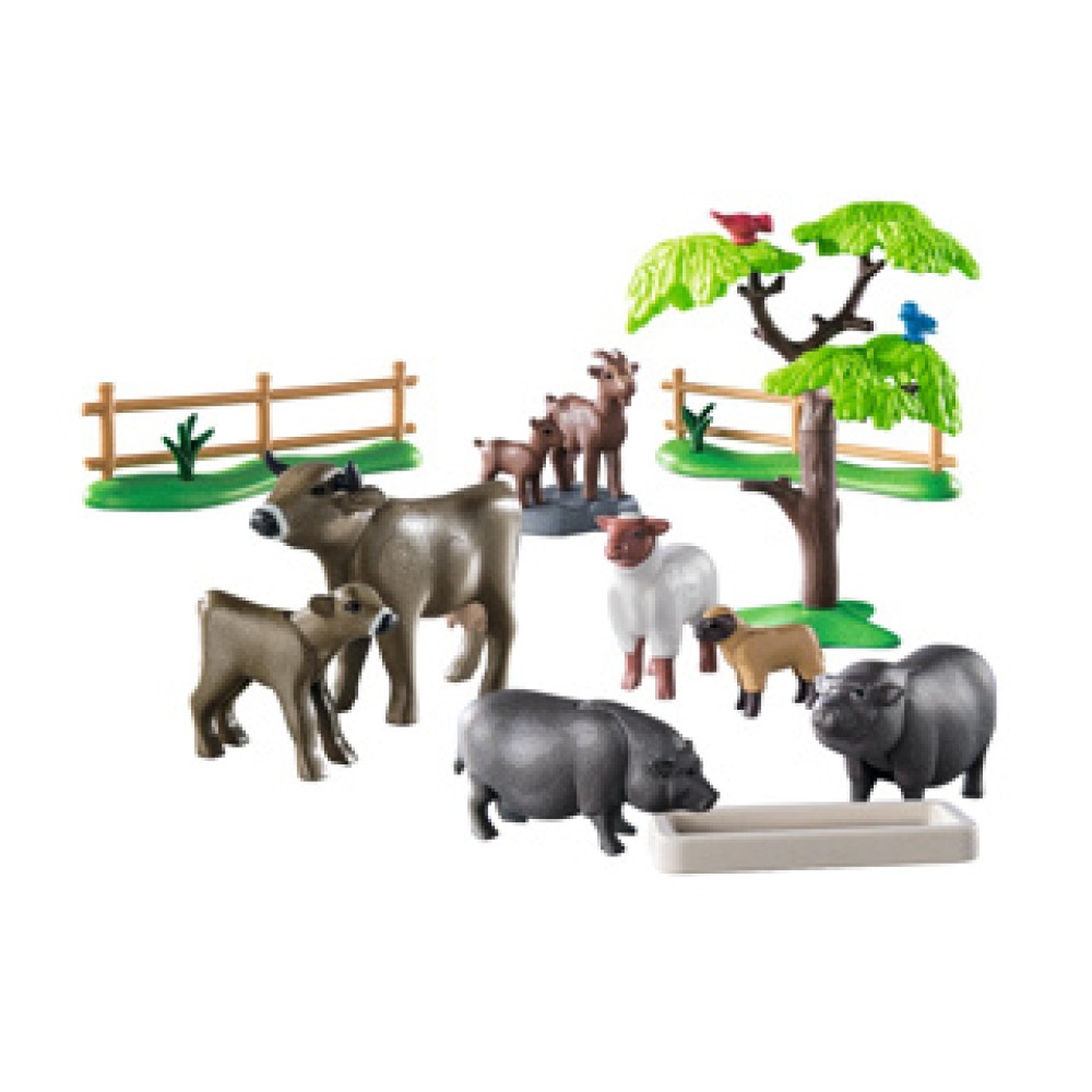 Is er nog plaats op jouw boerderij? Laat deze geweldige boerderijdieren dan bij je intrekken. Koeien, geiten, schapen en hangbuikzwijntjes verheugen zich op een gezellig thuis in de stal en op de wei, waar ze goed worden verzorgd. De PLAYMOBIL-boerderijwereld laat kinderen vanaf 4 jaar het leven en werk op het platteland van een nieuwe kant ontdekken. De gedetailleerde speelfiguren en dierensets inspireren keer op keer tot nieuwe verhalen, waarin zorgvuldig gebruik van onze natuurlijke hulpbronnen een natuurlijk onderdeel is van het dagelijks leven. Deze liefdevol vormgegeven dierenfigurenset bevat een koe met kalf, een geit met geitje, een schaap met lam, twee hangbuikzwijntjes en twee vogels.
