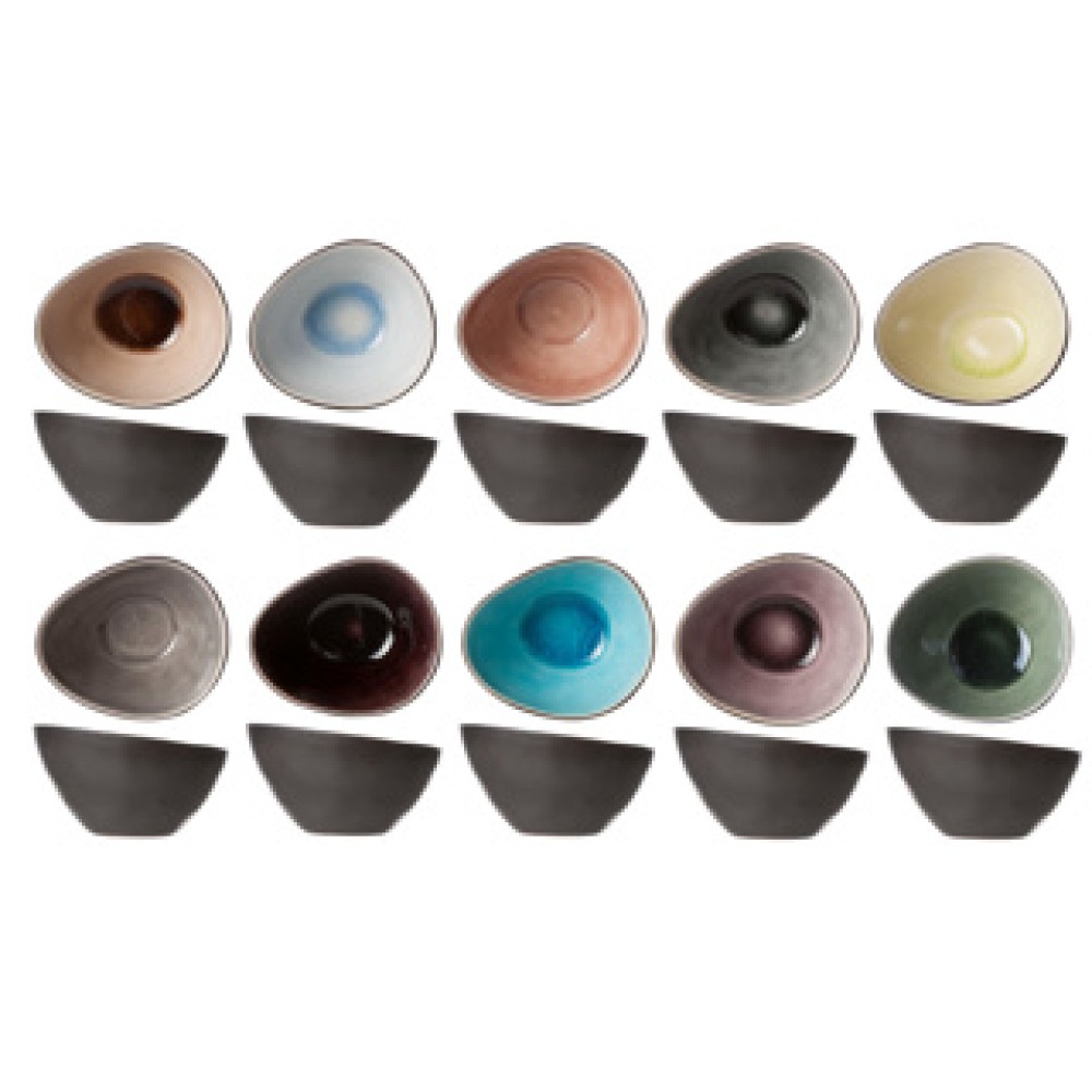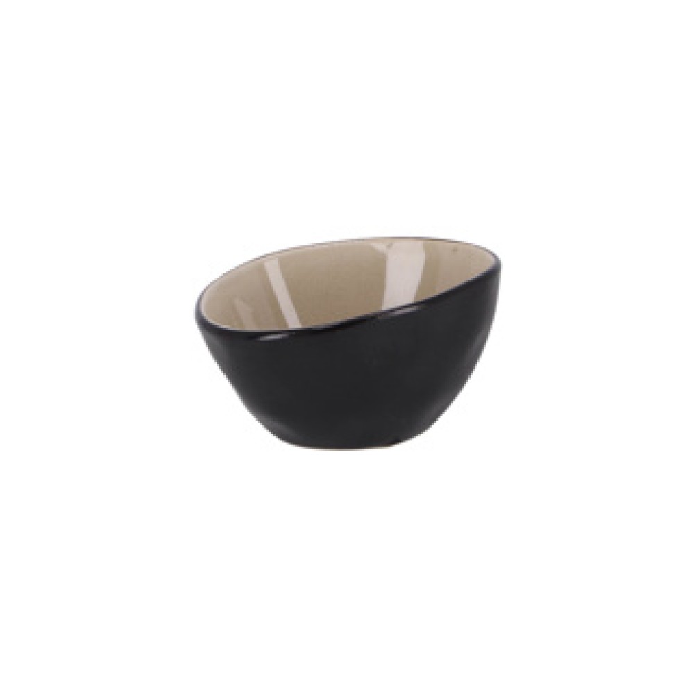 Deze moderne keramische schaal is perfect voor het serveren van kleine gerechtjes. Met een mooie combinatie van zwart en kleurrijk interieur voegt hij een stijlvolle touch toe aan je tafel op evenementen of feesten. De schaal heeft een ideale maat van 8,5x7xh4,5 cm.
