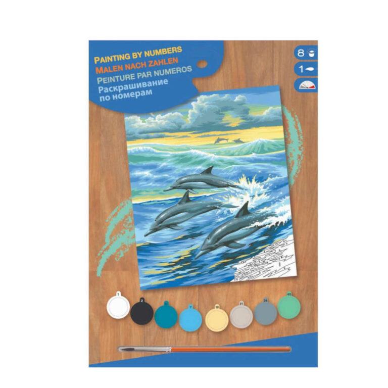 Met schilderen op nummer kun je de mooiste schilderijen maken. Zoek uit welke kleur bij welk nummer hoort en kleur alle nummers daarna in. Als je klaar bent, heb je een prachtig schilderij van drie dolfijnen die zwemmen in de zee. Hang het op in je kamer of maak er een cadeau van!
