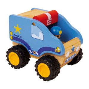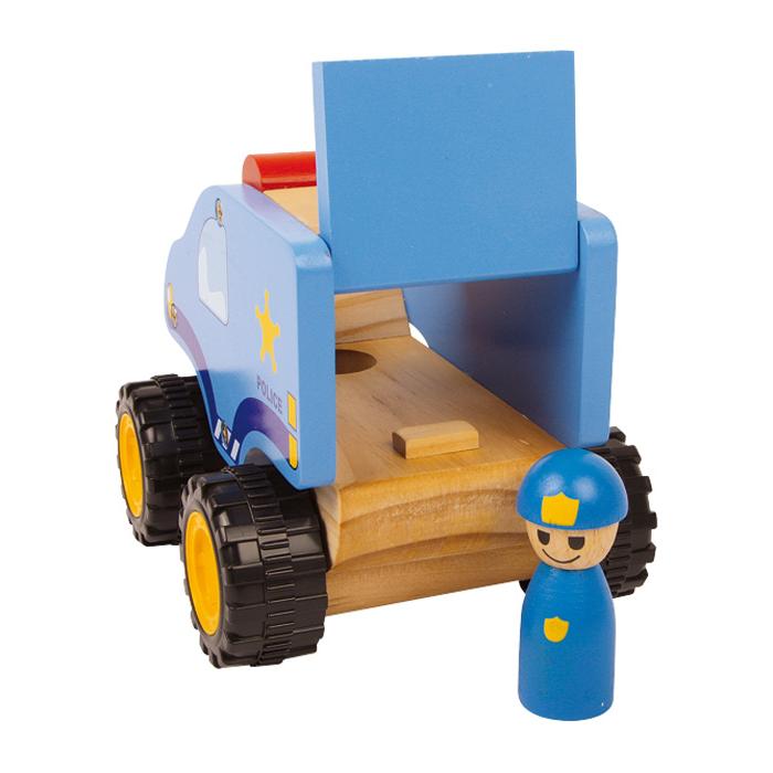 Een fantastische politieauto gemaakt van een hoogwaardige kwaliteit massief hout. De politieauto wordt bestuurd door een politieagent (6,5 x 2,5 cm). Deze auto is voorzien van kunststof wielen met een metalen as. Aan de achterzijde van de politieauto bevindt zich een schuifklep die kan worden geopend en kan worden gesloten. Hier kun je de gevangen boef in opsluiten en naar de gevangenis brengen!