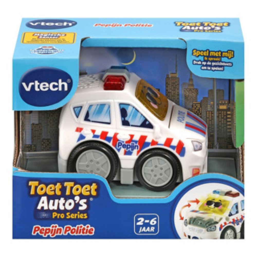 Vtech Toet Toet Pepijn Politie. Met knipperende gezicht-toets en realistische geluiden. Druk op de actie-toets om beweging en geluid te activeren. Magische sensor herkenning activeert grappige zinnetjes, vrolijke liedjes en melodietjes. Te gebruiken met de Toet Toet Auto’s speelsets. 6 melodietjes en 3 gezongen liedjes, waaronder het Toet Toet Auto’s themalied. Nederlands gesproken. Stevig en duurzaam design. Aan/Uit-schakelaar. Automatische uitschakeling. Geschikt voor kinderen vanaf 2 jaar.