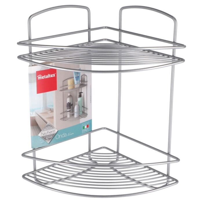 Organiseer uw badkamer met het stijlvolle Metaltex Badkamer Rek Onda. Dit praktische hoekkastje biedt ruimte voor al uw kleine badkameraccessoires, zoals shampoo en tandpasta. Dankzij de twee niveaus en het slimme design benut u de hoeken van uw badkamer optimaal. Het rek is vervaardigd met een roestwerende en antistatische coating, waardoor het onderhoud eenvoudig is en stof geen kans krijgt. Het elegante zilveren ontwerp voegt een moderne touch toe aan uw badkamerinterieur, waardoor functionaliteit en esthetiek perfect samenkomen. Maak uw badkamer overzichtelijk en aantrekkelijk met dit veelzijdige rek.