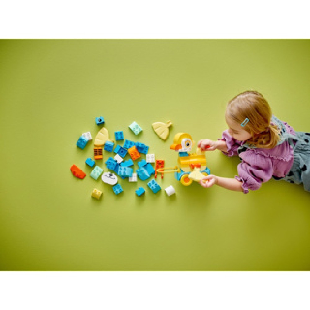 Laat de creativiteit van uw peuter tot leven komen met de LEGO DUPLO Town 3-in-1 Dieren op Wielen. Dit kleurrijke bouwspeelgoed biedt eindeloze mogelijkheden om verschillende dieren te maken, zoals een eend, vis of hond. Met de beweegbare onderdelen en de wielbasis kunnen kinderen hun dieren zelf voorttrekken.