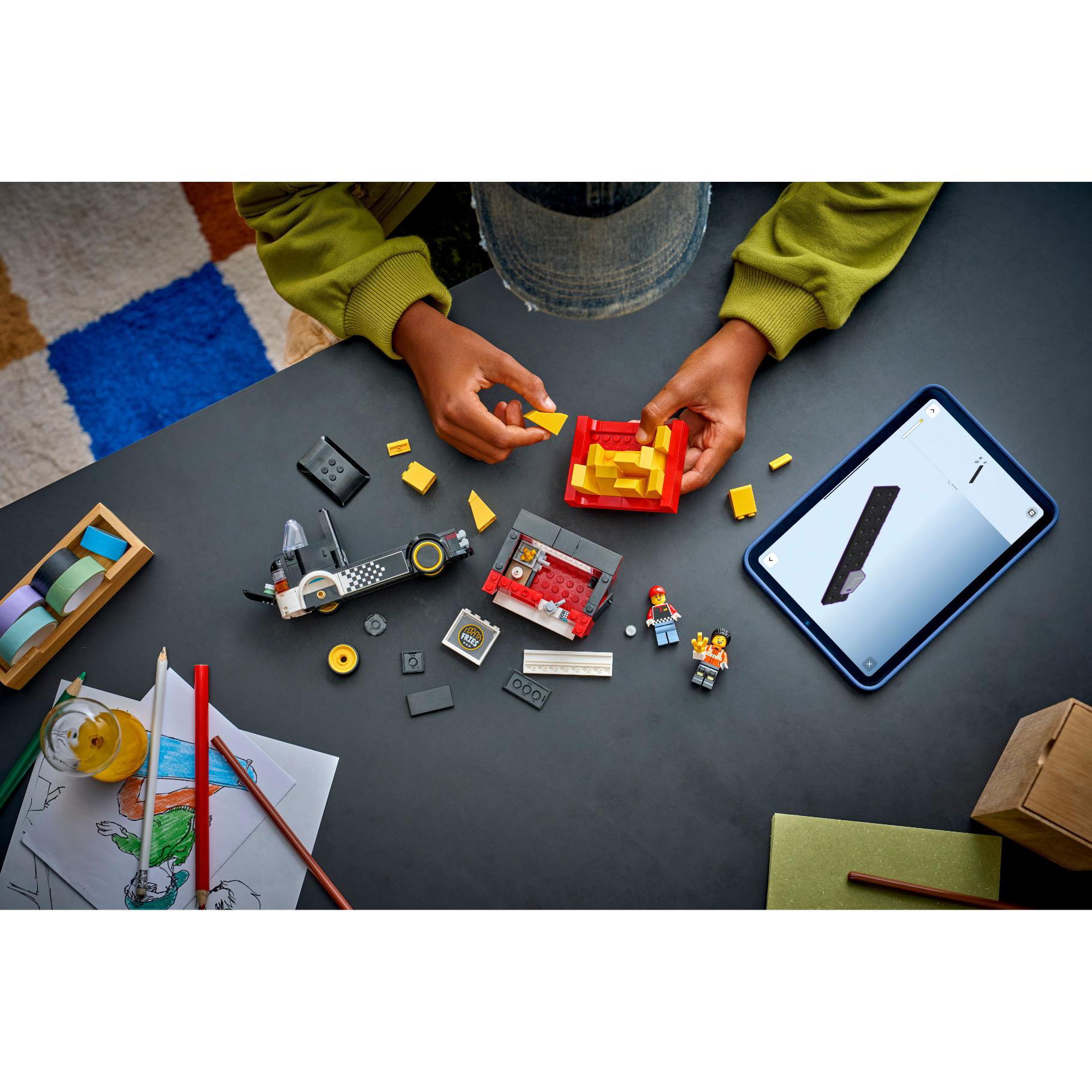 - LEGO® MINIFIGUURACCESSOIRES – deze foodtruckset voor kinderen wordt geleverd met accessoires, waaronder een ketchupfles en een portie patat