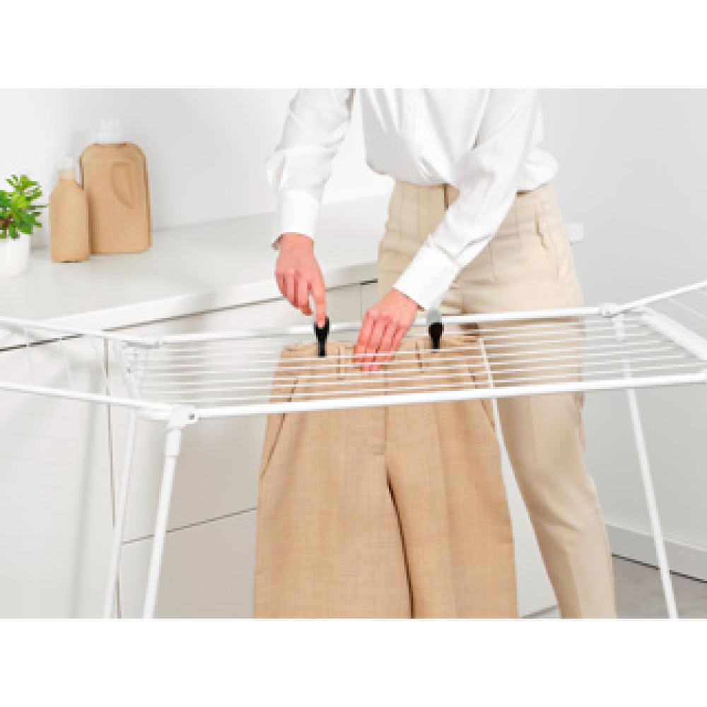 Met het Brabantia HangOn droogrek Too wordt het drogen van wasgoed een stuk gemakkelijker. Dankzij het slimme ontwerp neemt het weinig vloeroppervlak in beslag, waardoor je meer ruimte overhoudt in je huis. Geniet van een georganiseerde en nette wasruimte met dit handige droogrek!