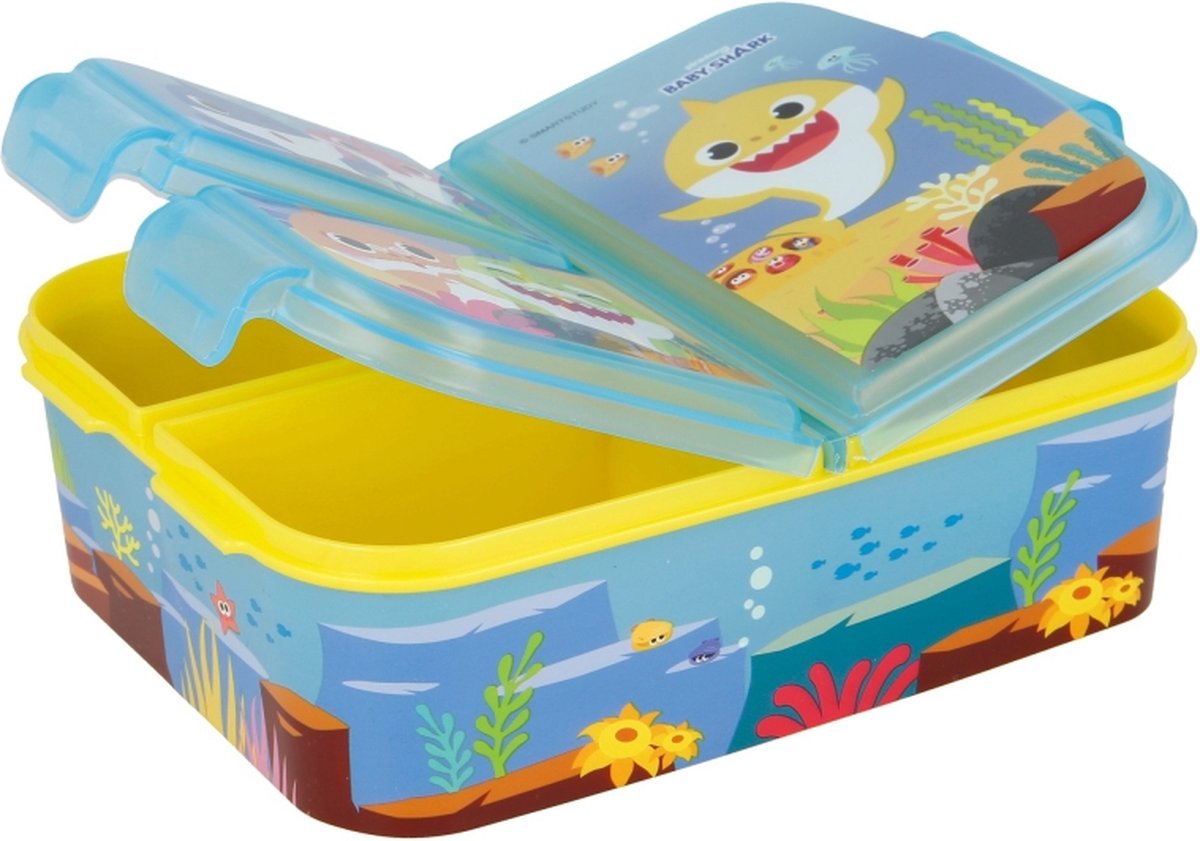 De lunchbox heeft drie kleine vakken en één groot vak, zodat je brood, fruit en koekjes apart kunt bewaren.