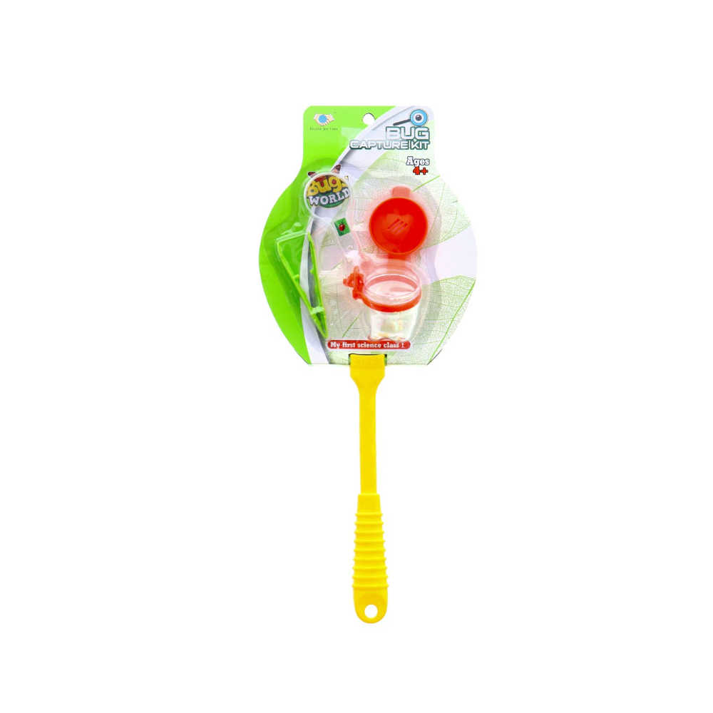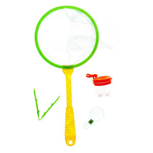 4-delige set om insecten te vangen en te bestuderen. Inhoud: - 1 vangnet - 1 doorzichtig potje (oranje en groene variant, willekeurige levering) - 1 pincet (oranje en groene variant, willekeurige levering) - 1 vergrootglas
