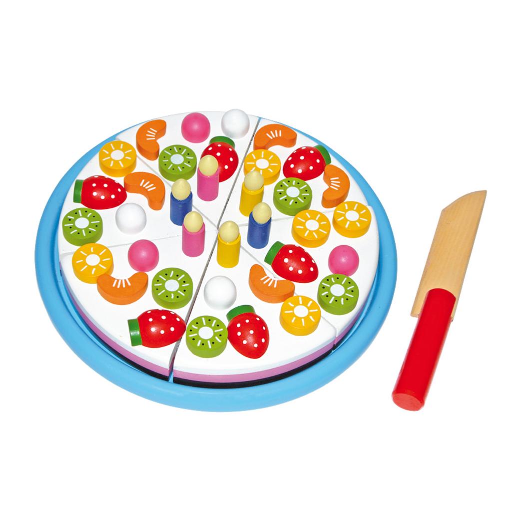 Een prachtige speelgoed verjaardagstaart die geheel naar eigen smaak kan worden gemaakt en worden gesneden. De verjaardagstaart is voorzien van verschillende kaarsjes en stukken fruit. Gemaakt van bijzonder fraai gelakt hout. De taart is voorzien van klittenband waardoor de stukken uit elkaar gesneden kunnen worden door middel van het mes.