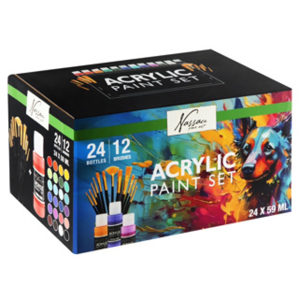 Met de Plakkaatverf acrylic set compleet tover je elk kunstproject om in een waar kunstwerk. Deze set bevat 24 tubes acrylverf van 59 ml en 12 kwasten, perfect voor zowel beginners als ervaren schilders. Van kleurige schilderijen tot creatieve knutselprojecten, er is geen grens aan je verbeelding!