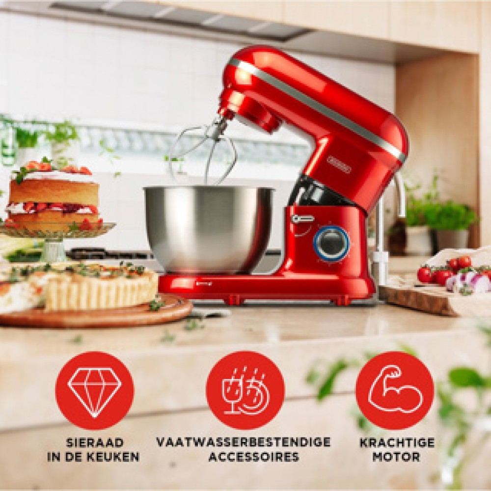 De Bourgini Classic Kitchen Chef in een opvallende rode kleur is de ideale keukenvriend voor iedereen die van koken houdt. Met een royale capaciteit is deze multifunctionele keukenmachine perfect voor het mixen, kneden en mengen van al je favoriete ingrediënten. Dankzij de verschillende snelheidsinstellingen en de bijgeleverde accessoires maak je gemakkelijk de meest uiteenlopende lekkernijen. Het stijlvolle design voegt niet alleen functionaliteit toe, maar ook flair aan je keuken. Deze keukenmachine is een grote aanwinst voor zowel hobbykoks als professionele chefs die efficiënt en met plezier willen werken.
