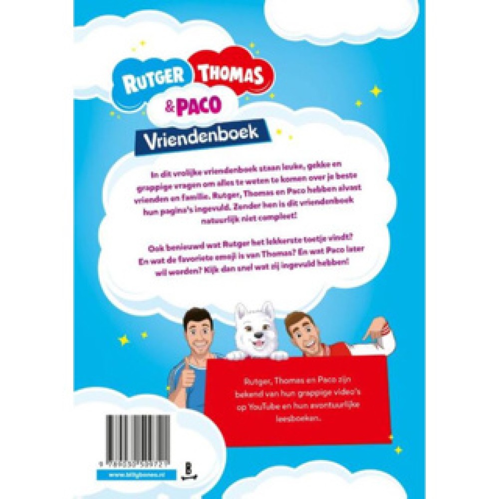 Het Vriendenboek Rutger, Thomas & Paco is de perfecte manier voor kinderen om nog meer over hun vrienden te leren. Dit interactieve vriendenboek bevat leuke en gekke vragen, rechtstreeks van de populaire YouTubers en hun schattige hond Paco. Samen plezier maken en kostbare herinneringen delen was nog nooit zo makkelijk!