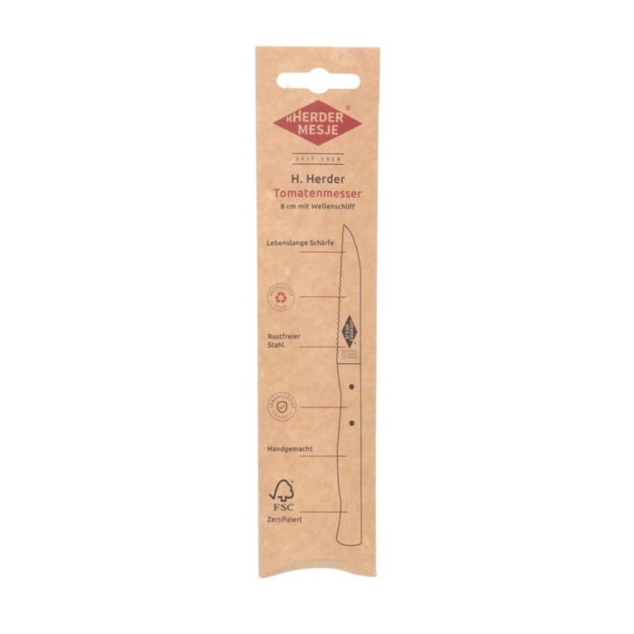 Ontdek het Herder tomatenmes, een gespecialiseerd keukengerei dat perfect is voor het snijden van tomaten en delicate vruchten. Met zijn gekartelde rand en scherpte, biedt dit mes een moeiteloze snijervaring. Gemaakt van hoogwaardig roestvrij staal en voorzien van een heft van FSC-gecertificeerd beukenhout, combineert het niet alleen functionaliteit, maar ook duurzaamheid. Dit mes is ontworpen om levenslang scherp te blijven, waardoor het een onmisbare aanvulling is voor elke thuischef. Geniet van precisie en kwaliteit in uw keuken met dit prachtige tomatenmes.