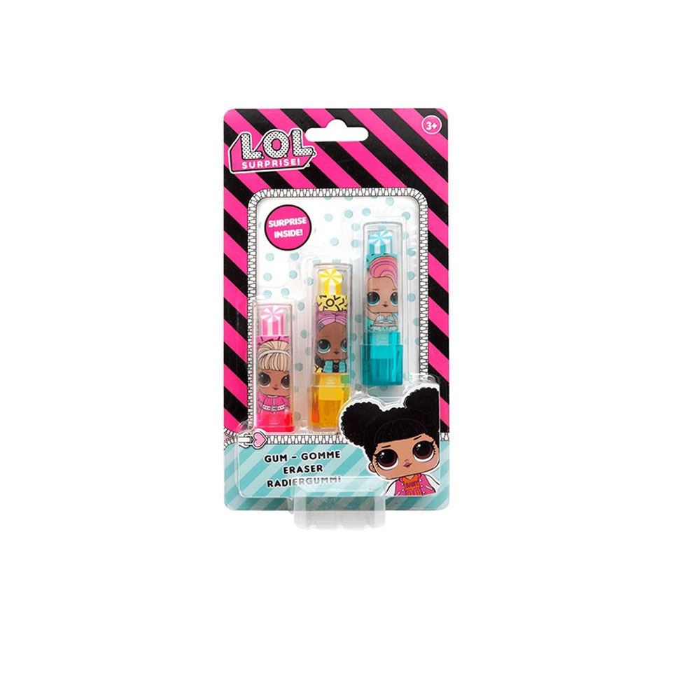 L.O.L. Lippenstiftgummen -3st op kaart Drie lippenstiftgummen waarmee je lijnen of teksten kunt verwijderen die met potlood of vulpotlood zijn geschreven. Alle gummen zijn voorzien van een leuke L.O.L decoratie. Inhoud: