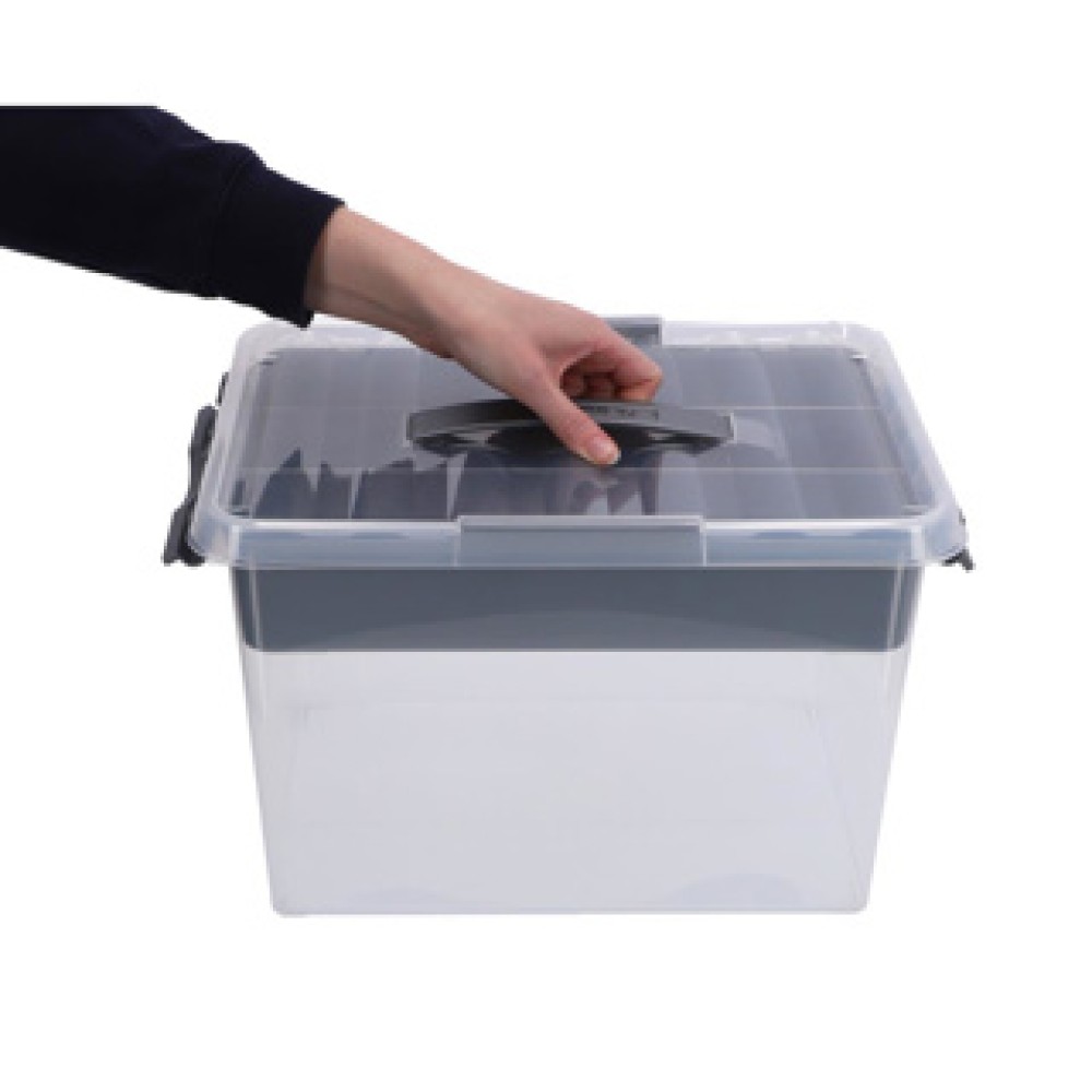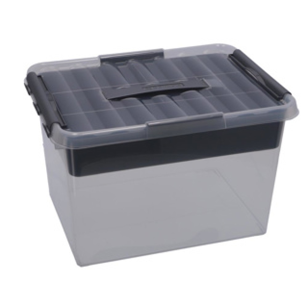 Organiseer je spullen met de Sunware Q-Line opbergbox van 22 liter. Deze transparante kunststof box is perfect voor het opbergen van klein gereedschap en andere kleine items. Het stevige grijze deksel sluit met vier klemmen, waardoor je spullen veilig zijn opgeborgen.