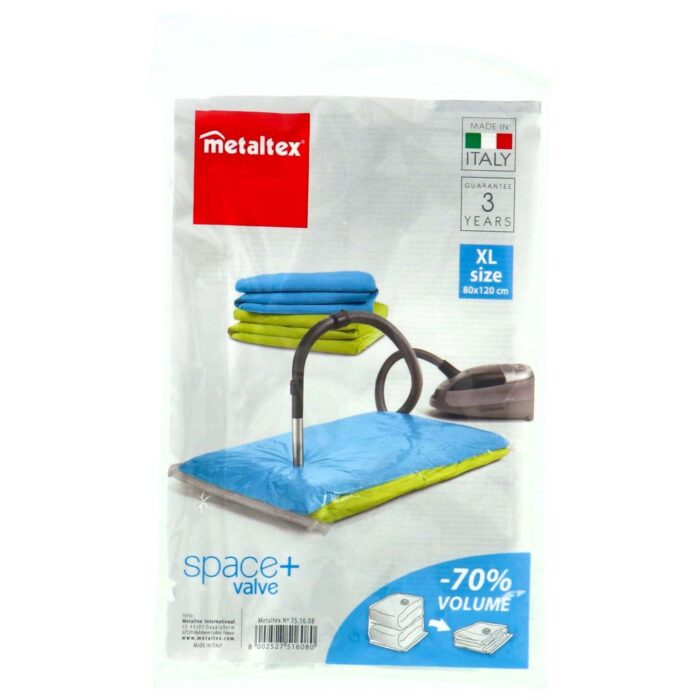 Ontdek de handige Metaltex Vacuumzak met luchtdicht ventiel, perfect voor het opbergen van kleding en handdoeken. Deze ruime zak maakt gebruik van een stofzuiger om lucht te verwijderen, waardoor je kostbare opbergruimte bespaart. Het slimme ontwerp zorgt ervoor dat je eenvoudig toegang hebt tot je spullen wanneer je ze nodig hebt. Met deze vacuumzak blijft alles beschermd tegen stof en vocht, ideaal voor een georganiseerde en compacte opbergoplossing in huis of op reis. Maak je leven gemakkelijker met deze praktische toevoeging aan je huis!