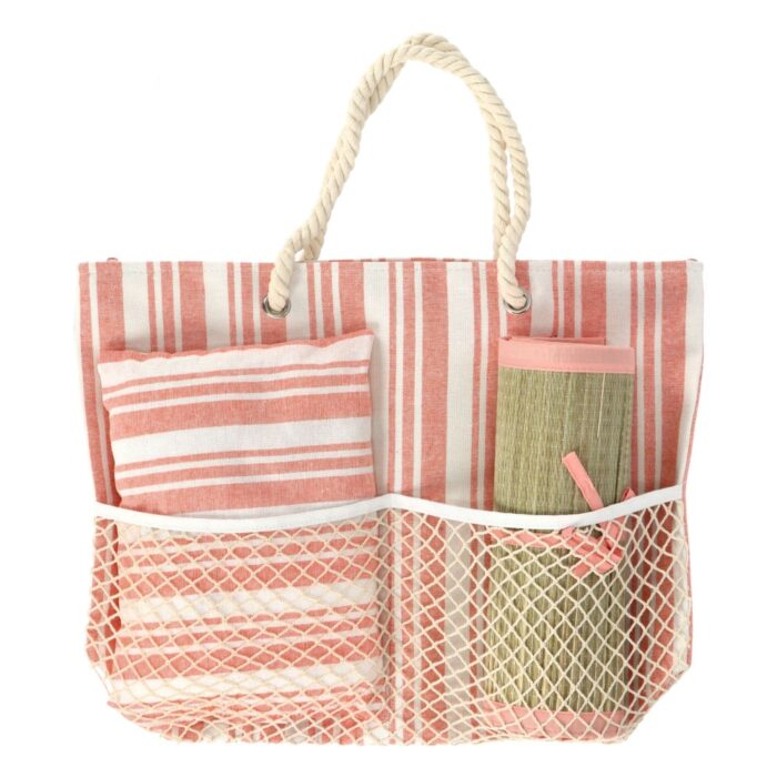 Heerlijk genieten van een dagje strand begint met de strandtas met geïntegreerde strandmat en kussen. Deze handige tas biedt alles wat je nodig hebt om comfortabel te loungen in de zon. Met een slim ontwerp is het perfect voor jouw zomerse avonturen.