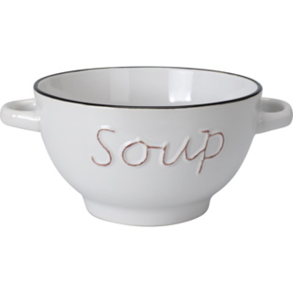 Geniet volop van je favoriete soepen met onze stijlvolle soepkom van aardewerk. Deze kom is niet alleen mooi om te zien, maar ook praktisch in gebruik. De twee handvatten zorgen voor een fijne grip en maken het serveren eenvoudig. Met het leuke woord “Soup” op de kom breng je sfeer aan tafel.