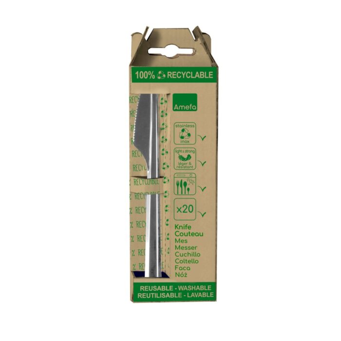 Ontdek de Amefa Leaves wegwerp tafelmessen, een stijlvolle en duurzame keuze voor elk evenement. Deze roestvrijstalen messen zijn ontworpen als milieuvriendelijk alternatief voor plastic bestek, voldoen aan Europese wetgeving en zijn volledig recyclebaar. Lichtgewicht en vaatwasmachinebestendig, ze zijn perfect voor meervoudig gebruik, of het nu gaat om feesten, picknicks of barbecue's. Met hun ergonomische ontwerp en glanzende handgreep voegen ze een vleugje elegantie toe aan elke tafelsetting. Maak een bewuste keuze zonder in te boeten op stijl of functionaliteit.