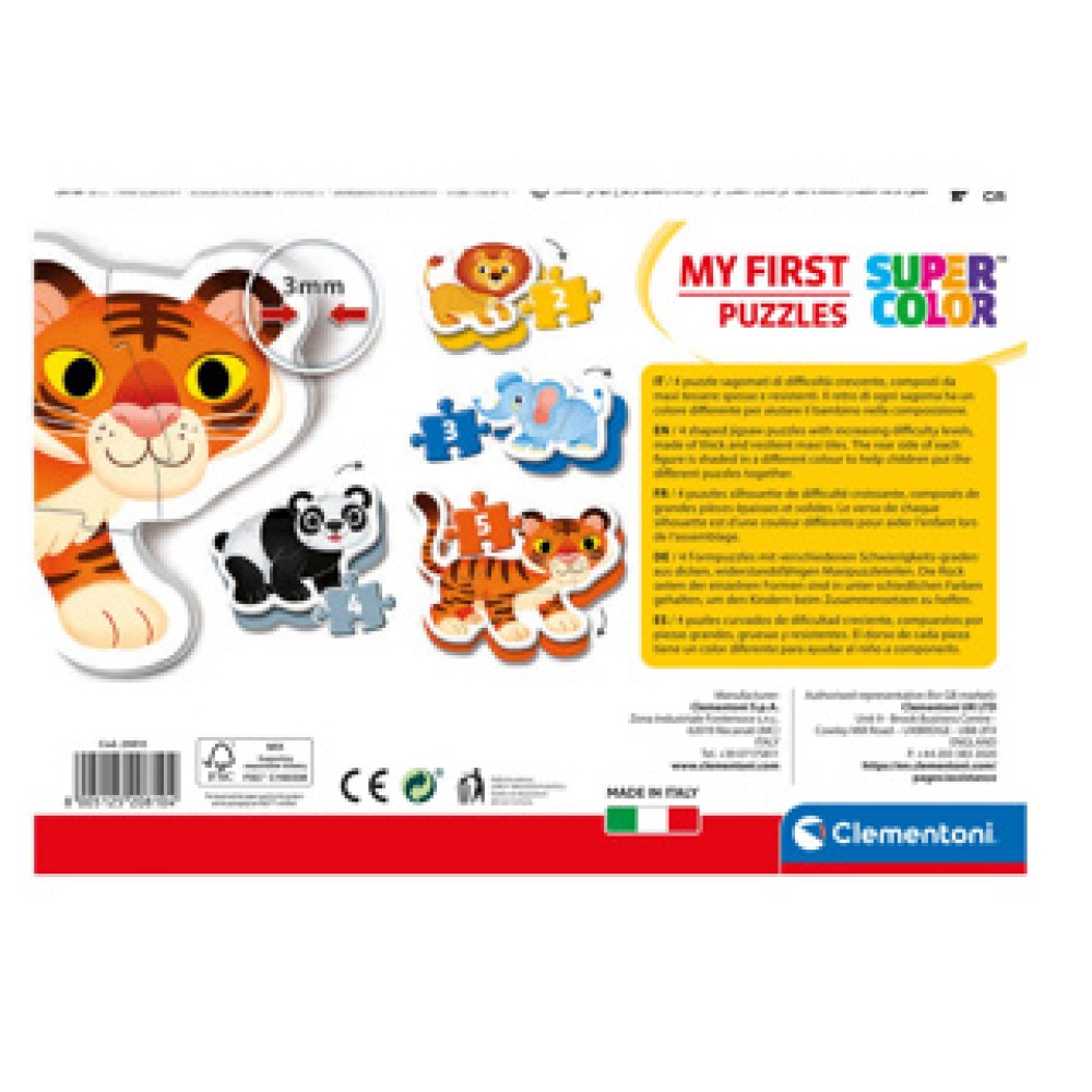 Educatieve puzzelset van Clementoni met 4 puzzels van 3, 6, 9 en 12 stukjes, met vrolijke afbeeldingen van wilde dieren. Ideaal voor jonge kinderen vanaf 2 jaar om stap voor stap puzzelervaring op te bouwen.