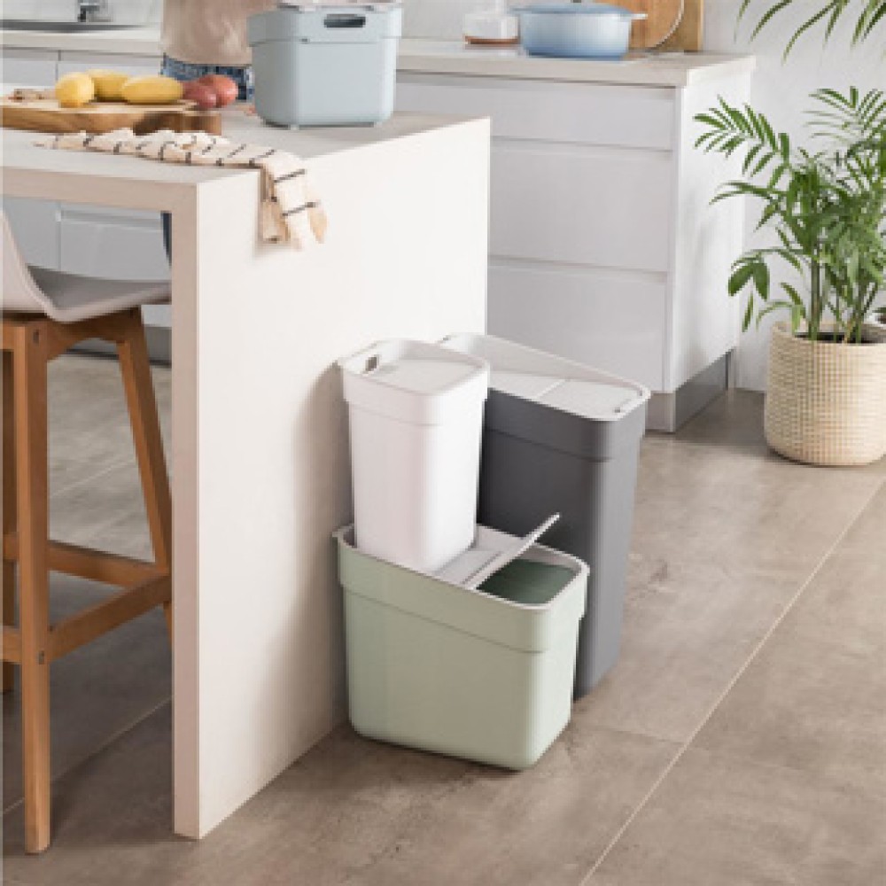 Ontdek de Ready To Collect afvalbak, een slimme en stijlvolle oplossing voor afvalscheiding in huis. Gemaakt van volledig gerecycled kunststof, biedt deze modulaire prullenbak de mogelijkheid om papier, plastic en organisch materiaal eenvoudig te scheiden. Het fraaie groen en grijze kleurenpalet maakt het een aantrekkelijke toevoeging aan elke keuken of garage. Dankzij het stapelbare ontwerp bespaar je ruimte zonder in te boeten op functionaliteit. Maak duurzaamheid eenvoudig en chic met deze praktische afvaloplossing.