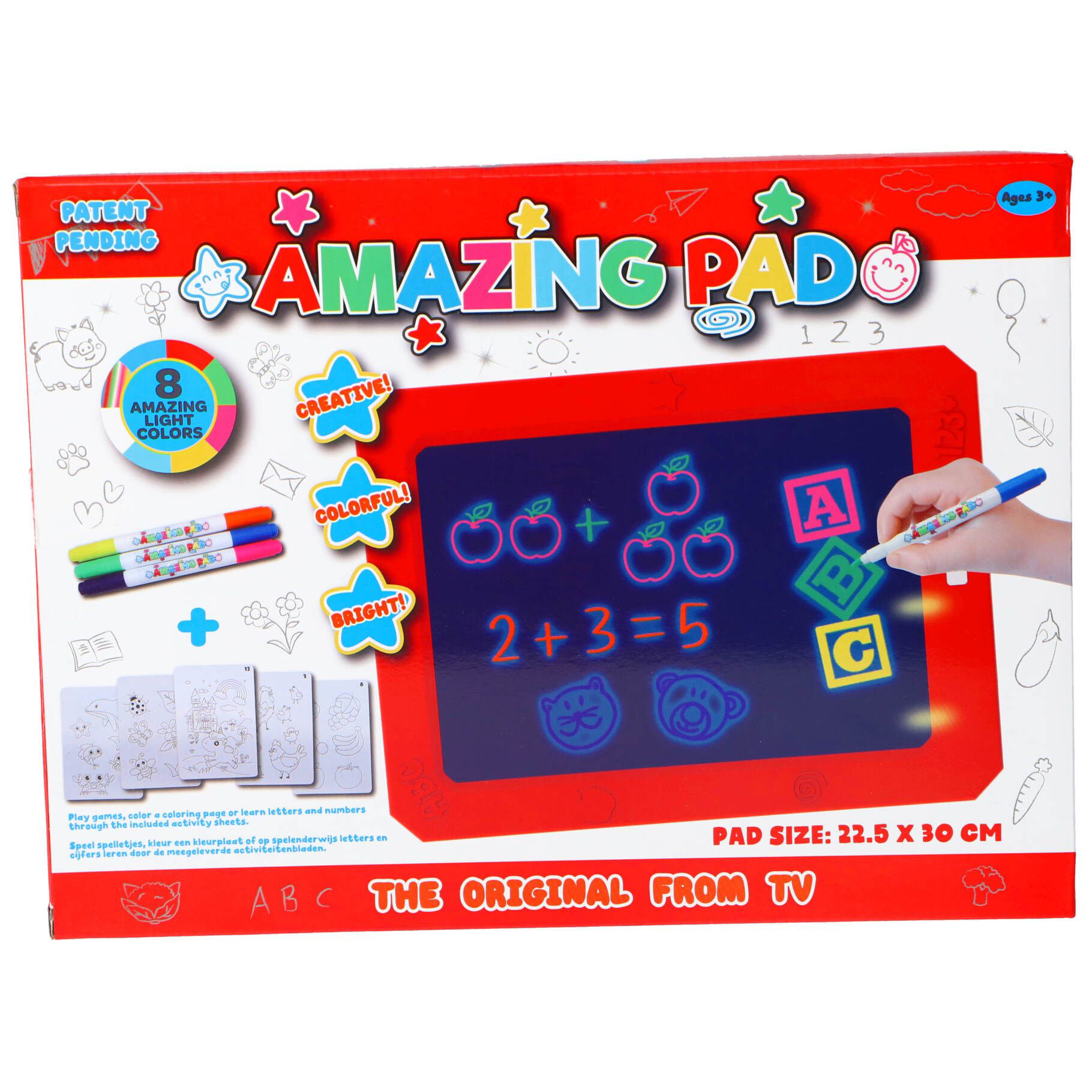 Amazing pad. Maak de mooiste tekeningen op de Amazing Pad, en breng ze tot leven met de verschillende kleuren licht! In het donker zal dit voor een spectaculair effect zorgen. De amazing pad komt met 3 dubbelzijdige stiften, 5 sjablonen en een schoonmaakdoekje. Excl. batterijen. Geschikt voor kinderen vanaf 3 jaar.