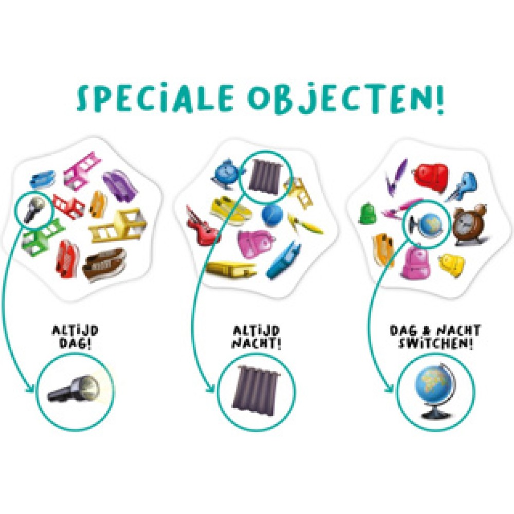 Dit unieke spel kan zowel overdag als ’s nachts gespeeld worden. Overdag zie je kleuren, terwijl je ’s nachts alleen op vormen kunt letten. Dit zorgt voor extra uitdaging en variatie!